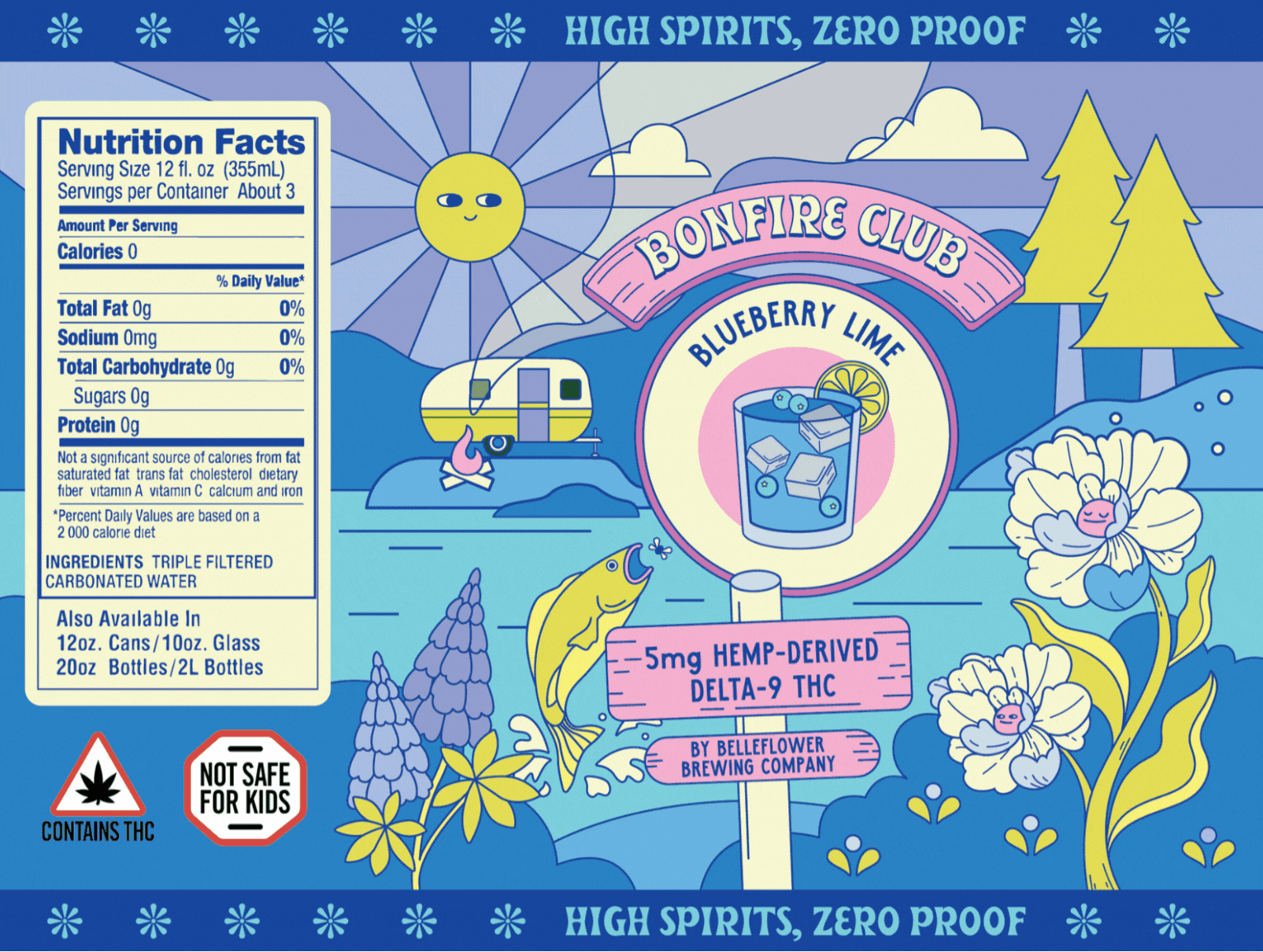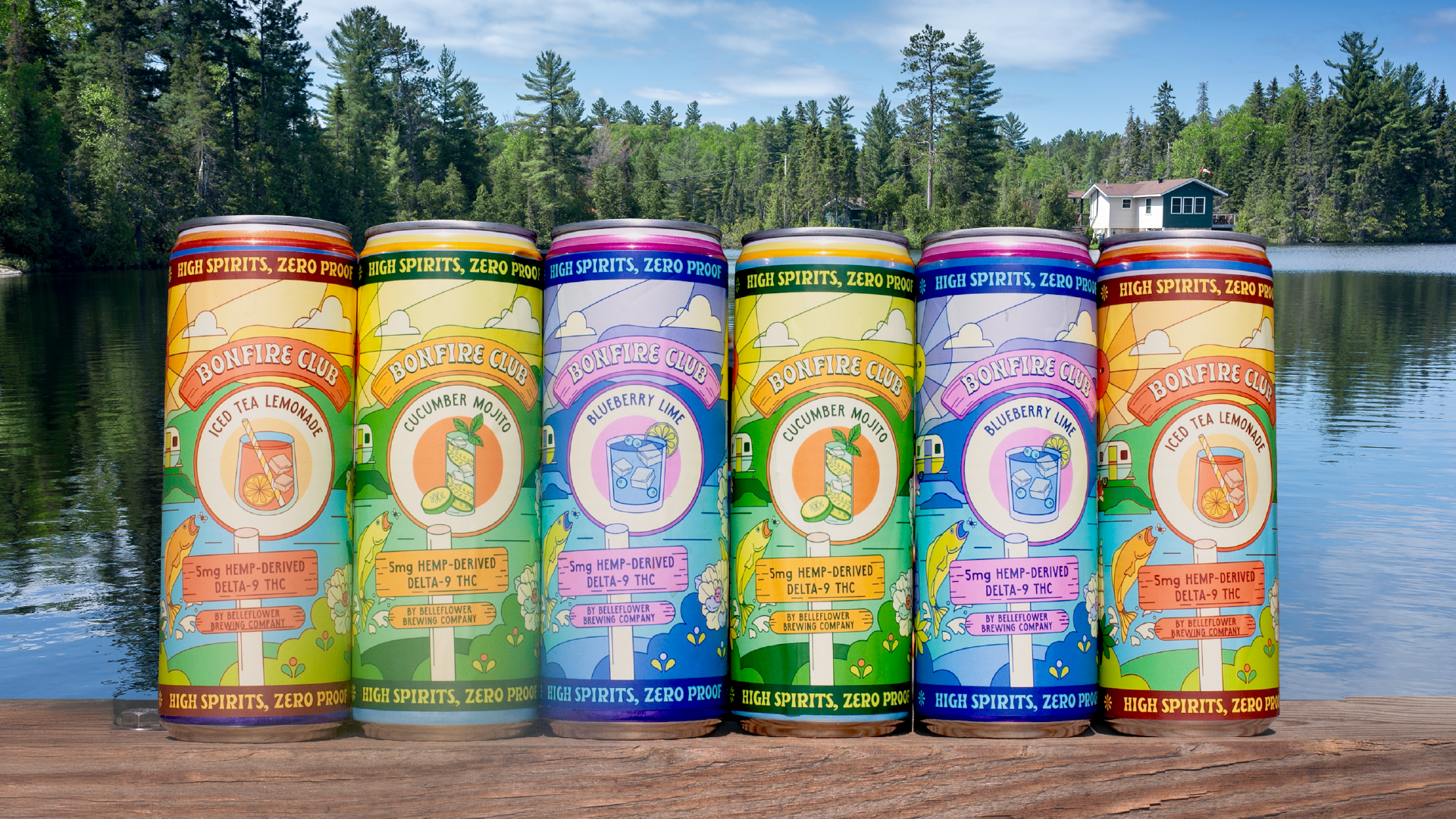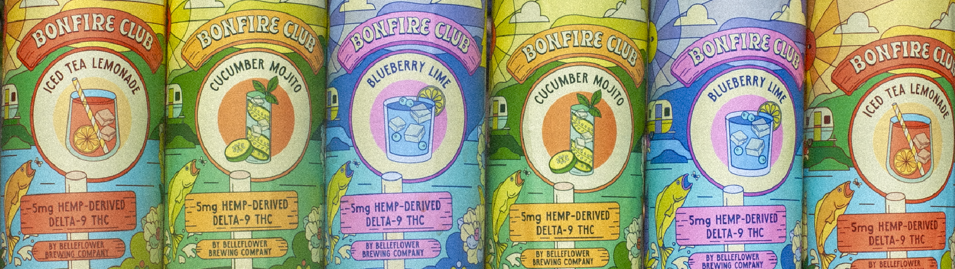 The creative direction leans into an illustrative style with a hint of Wes Anderson charm. Since Bonfire Club is based in Maine, we drew inspiration from the state’s vibrant summer landscapes. The result is a bold, slightly psychedelic visual identity that invites people to imagine themselves lakeside, unwinding with a beverage in hand.